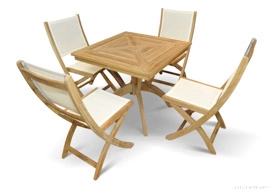 We use superior materials and techniques so that your teak dining furniture is attractive and made to last. Each piece is crafted exclusively from Grade A teak, with strong mortise and tenon joinery. Where needed – as with our teak folding chairs – all our fittings are solid brass. On our sling chairs, we use Batyline fabrics, which are extremely flexible and durable. If you need help making selections, please call us. Our pre-configured teak outdoor dining sets are offered at a discount, especially if you are ordering multiple sets for your restaurant or café.