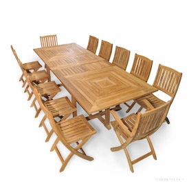 - 8+ Seaters – GOLDENTEAK’s teak patio dining sets for 8 – 14 guests allow you to host grand outdoor dinners or garden parties with ease. Most of the larger tables are extension tables, allowing the customer to use the set configured for 8 guests on a usual basis, and then expand it to 10 to 14 guests by extending the table by one leaf or two. These large teak outdoor dining sets are very popular with customers that entertain in style and those that have large families, children, cousins, grand children, nieces and nephews.