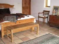 Teak Backless Bench Rosemont 4 ft is shown at the foot of a bed in this