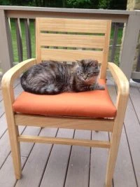 Goldenteak's Teak Stacking Chair Ventura serves as a comfortable resting place for the family cat.