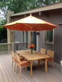 Goldenteak's Teak Patio Dining Sets can be configured to suit your need. Here is a Teak Dining Set that features the beautiful and well constructed Teak Sutton Dining Table (Code 320) and four Ventura Teak Stacking Chairs. The set is augmented with an Umbrella and Outdoor Cushions, both in Tangerine from Sunbrella. These photos from customers like you, help one consider different ideas and designs.